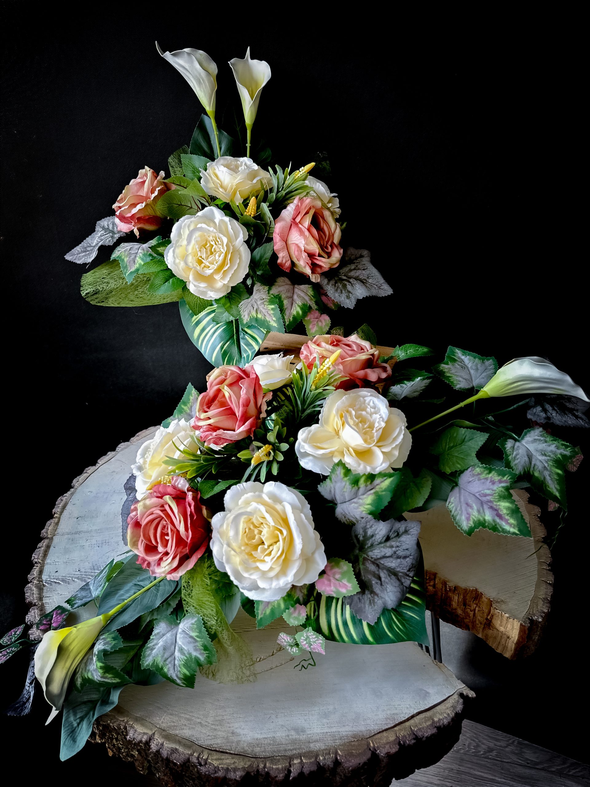 Komplet: kompozycja nagrobna oraz bukiet do wazonu. Całość wykonana w doniczkach które są obciążone cementem dzięki czemu dekoracje nie zostaną porwane przez wiatr. Wysokiej jakości kwiaty wyglądają bardzo elegancko i są trwałe. Kompozycje są ręcznie układane.